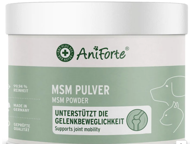 Methylsulfonylmethane is a natural substance that can supply your dog or cats body with vital sulphur. AniForte® MSM powder consists of pure methylsulphonylmethane and is therefore also suitable for pets with feed intolerance or allergies.