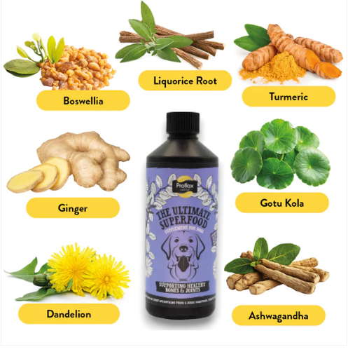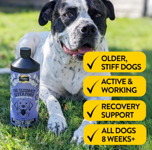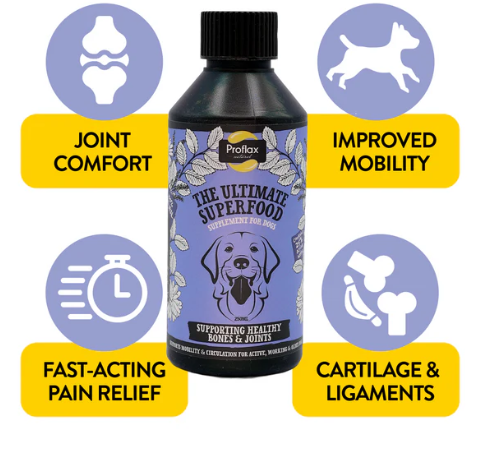 Proflax Bone & Joint is a 100% natural supplement for dogs that helps maintain joint health, flexibility, and comfort. Rich in Omega-3 from flaxseed oil and combined with herbs traditionally used to support mobility and connective tissue health, it’s ideal for active, working, or older dogs.