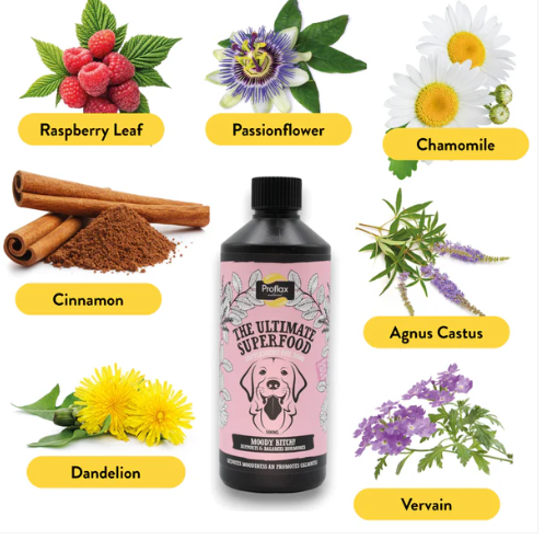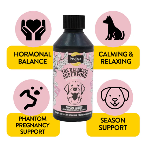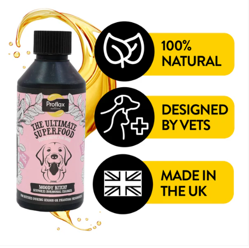 Proflax Moody Bitch is a 100% natural supplement designed to support hormonal balance and calm behaviour in female dogs. Made with flaxseed oil and carefully selected herbs, it helps maintain emotional stability and overall wellbeing before, during, and after seasons.